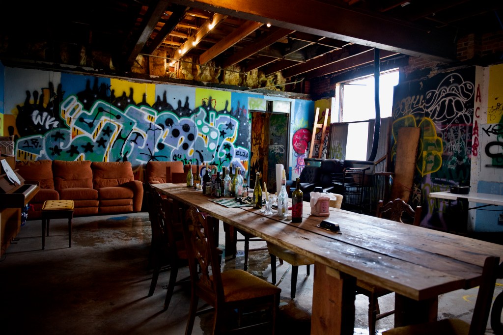 However, there was a time between the beginning of the pandemic and earlier this year when the building was actually occupied, as we learned over time on our bike rides. Sometimes we noticed faint light and music in the building through an open door, motorbikes in front of the building, and occasionally folks sitting on camping chairs on the stoop. First we thought those were squatters or homeless people. Over time we noticed a particular face of a young man over and over again, and he didn’t look like a homeless bum. In fact, he looked very muscular and healthy. Gradually, he started to wave at us when we rode by or saw him cruising on his motorbike through Railroad Square. We also saw him lifting weights in the building’s backyard, sometimes coaching others, and every so often we saw him running shirtless through Railroad Square with a group of friends. Perhaps he is some kind of personal trainer, living or squatting in the old building and running a makeshift gym? One evening in May 2023 we again rode down All Saints Street and saw him sitting on the stoop, and decided to stop and chat.